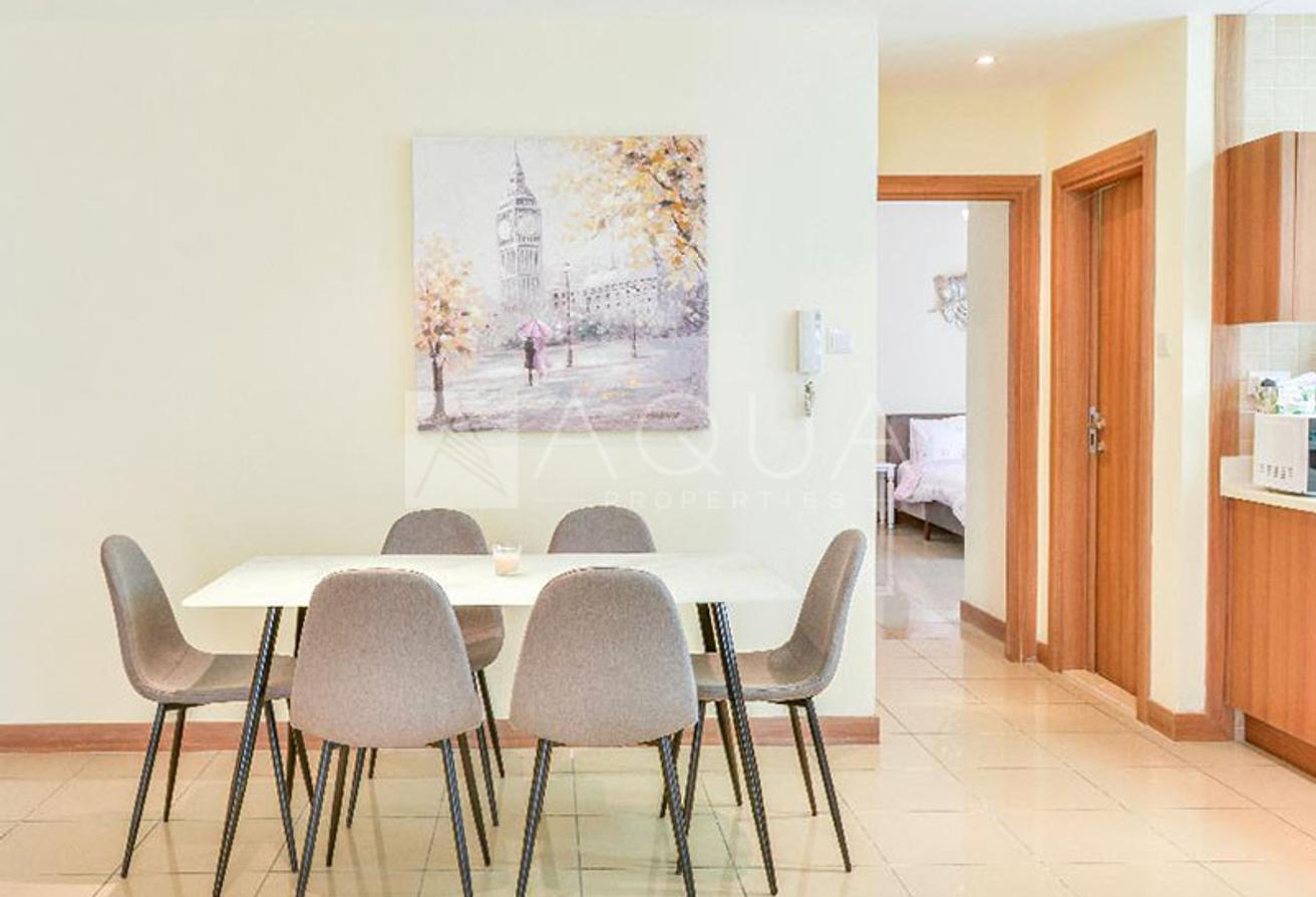 AQUA Properties is pleased to present this lovely furnished apartment in Sulafa Tower, Dubai Marina. This spacious unit consists of 2 comfortable bedrooms with built-in wardrobes, 3 bathrooms, a spacious living and dining area which is open to the kitchen, comes with a large balcony that overlooks the neighbourhood and partial sea and palm view.