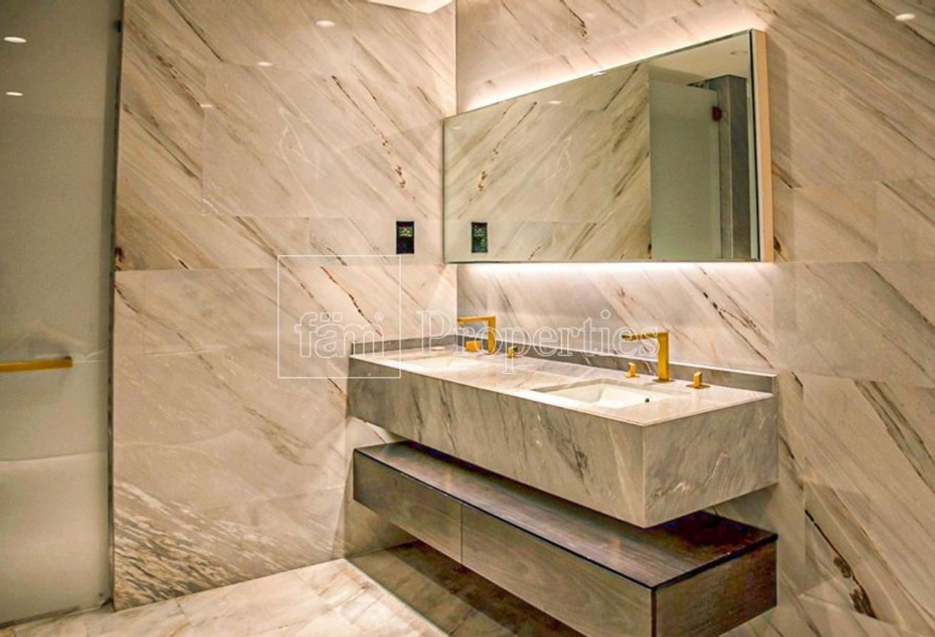Each bedroom boasts a spacious walk-in closet and an en-suite bathroom adorned with Greek and Italian marble, a rainfall shower, and a mirrored bathtub. They also come with LED TVs, a stylish refreshment center.
