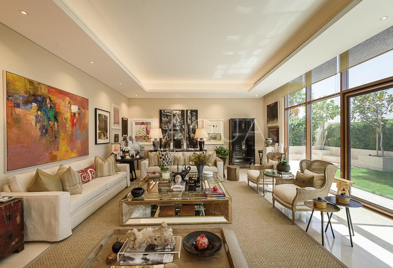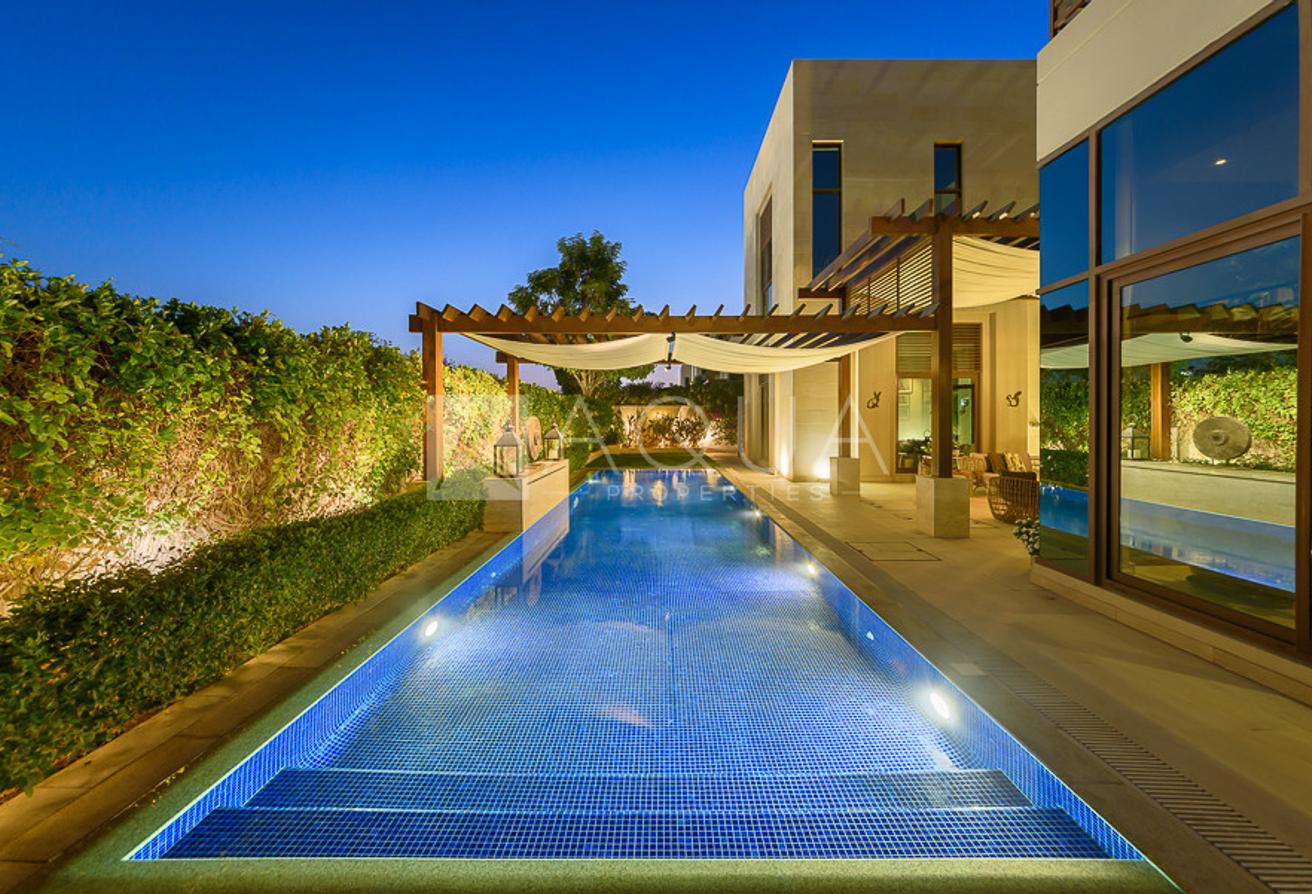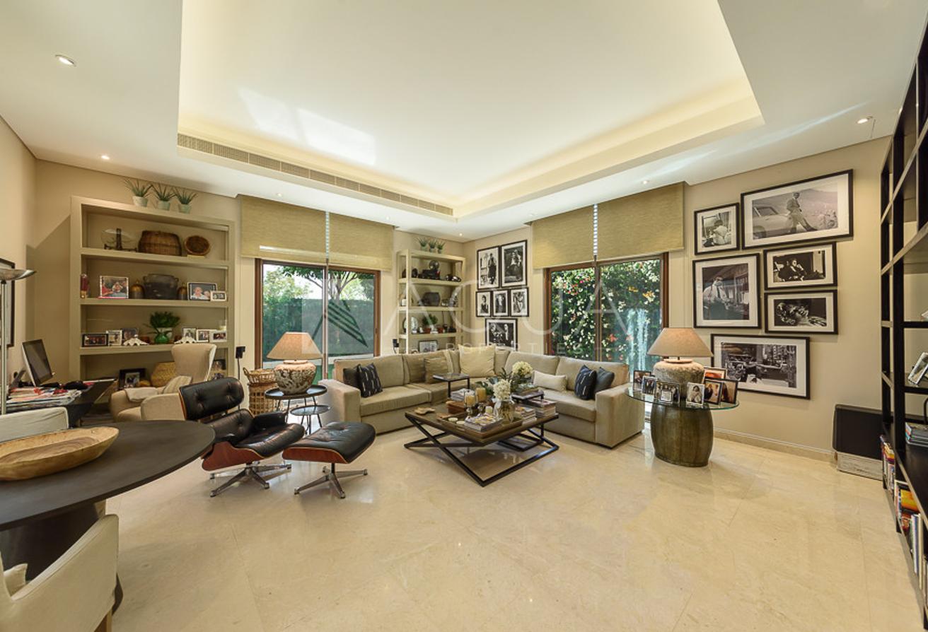Spanning over 8,070 square feet of built-up area, the villa features five sizeable bedrooms and seven bathrooms. The master bedroom comes with a generous walk-in closet, a well-appointed bathroom, and a large terrace. The villa also provides for separate housekeeper and driver’s rooms. There is an indoors games room, a private gym room, and stunning common areas.