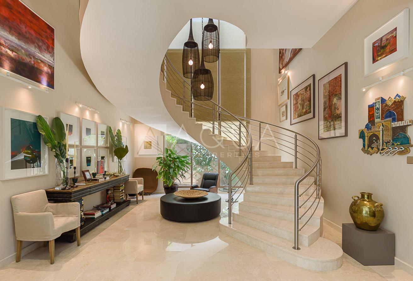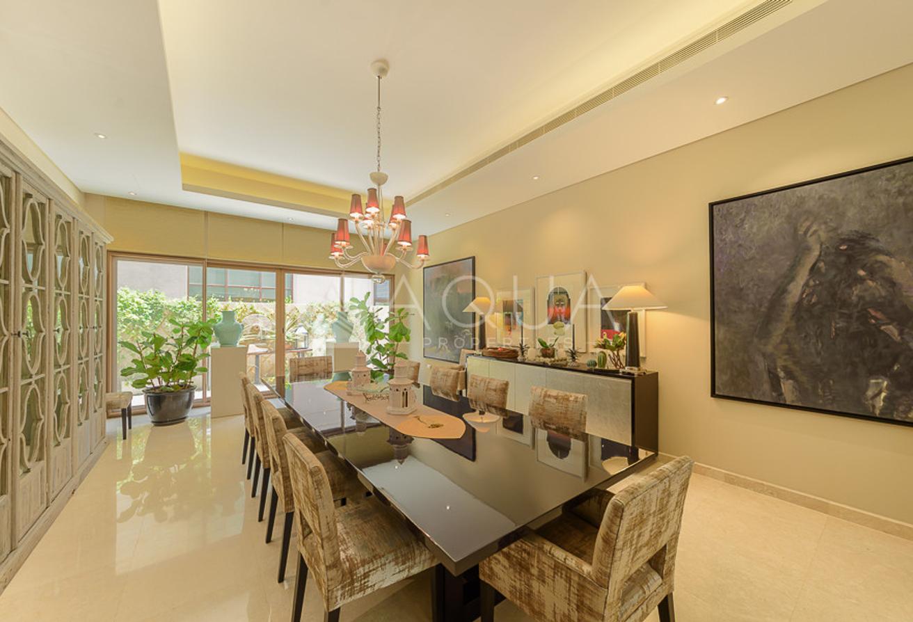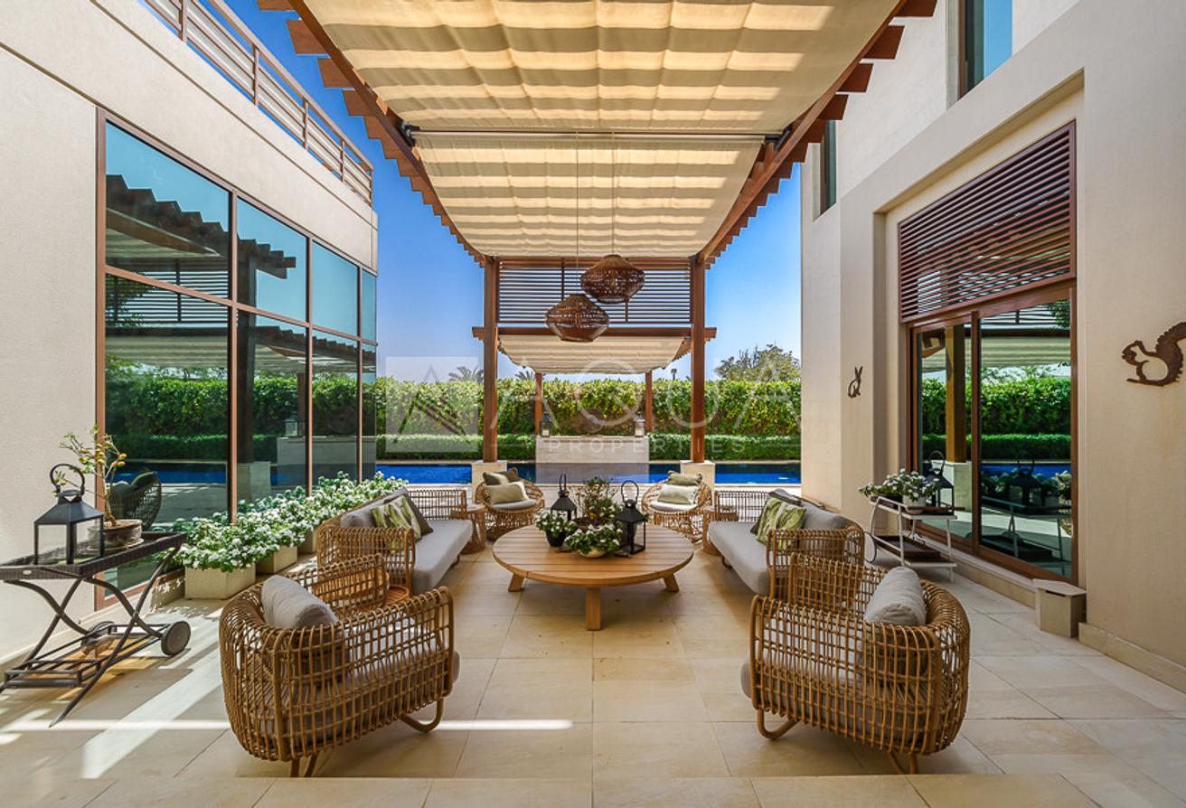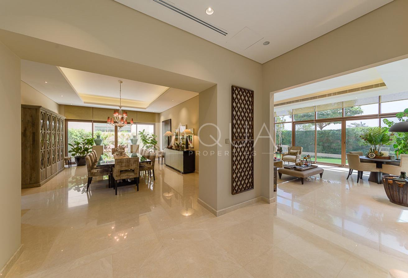 Spanning over 8,070 square feet of built-up area, the villa features five sizeable bedrooms and seven bathrooms. The master bedroom comes with a generous walk-in closet, a well-appointed bathroom, and a large terrace. The villa also provides for separate housekeeper and driver’s rooms. There is an indoors games room, a private gym room, and stunning common areas.